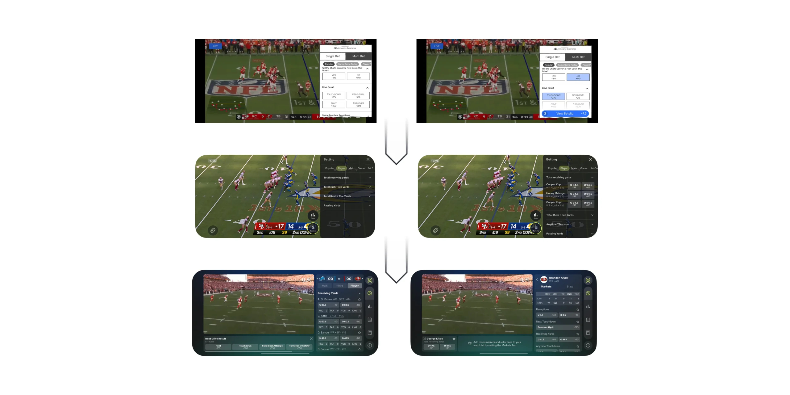 Apuestas y Estadísticas Integradas: Los usuarios pueden alternar estadísticas en vivo y mercados de apuestas que se superponen al video contextualmente, apareciendo solo cuando son relevantes o activados.